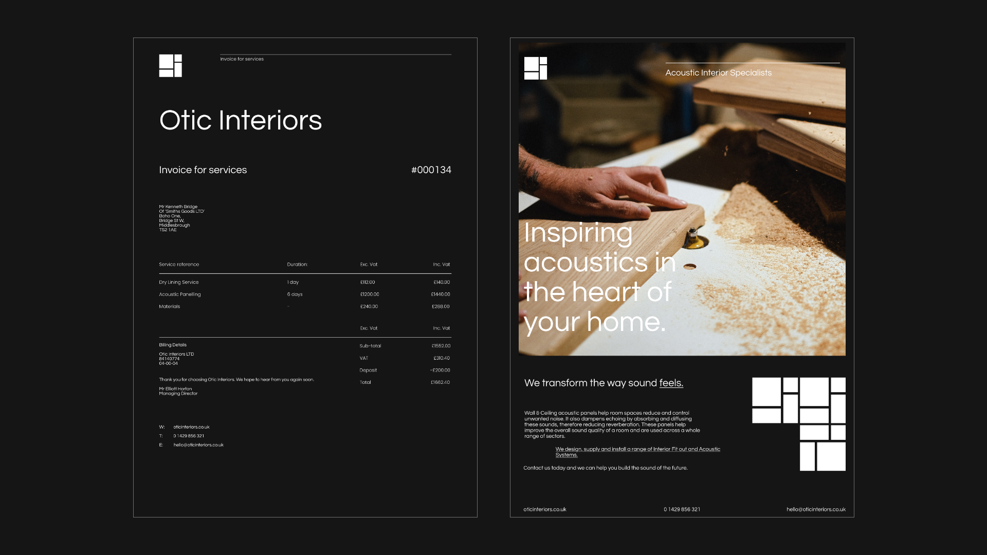 Otic Interiors is an Interior Acoustic Panelling specialist based in the Tees Valley. The idea was to bring together a contemporary, cohesive brand identity that emanates class and elegance within the Interior Design space.